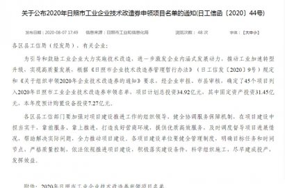 根據(jù)《日照市企業(yè)技術(shù)改造券管理暫行辦法》(日工信發(fā)〔2020〕9號)規(guī)定和《關(guān)于組織申領(lǐng)2020年企業(yè)技術(shù)改造券的通知》要求,經(jīng)積極申報(bào),通過市工業(yè)和信息化局審核,成功申領(lǐng)2020年日照市工業(yè)企業(yè)技術(shù)改造券。